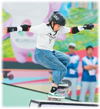 上海队选手徐琳泷在滑板比赛中。新华社记者 刘坤 摄